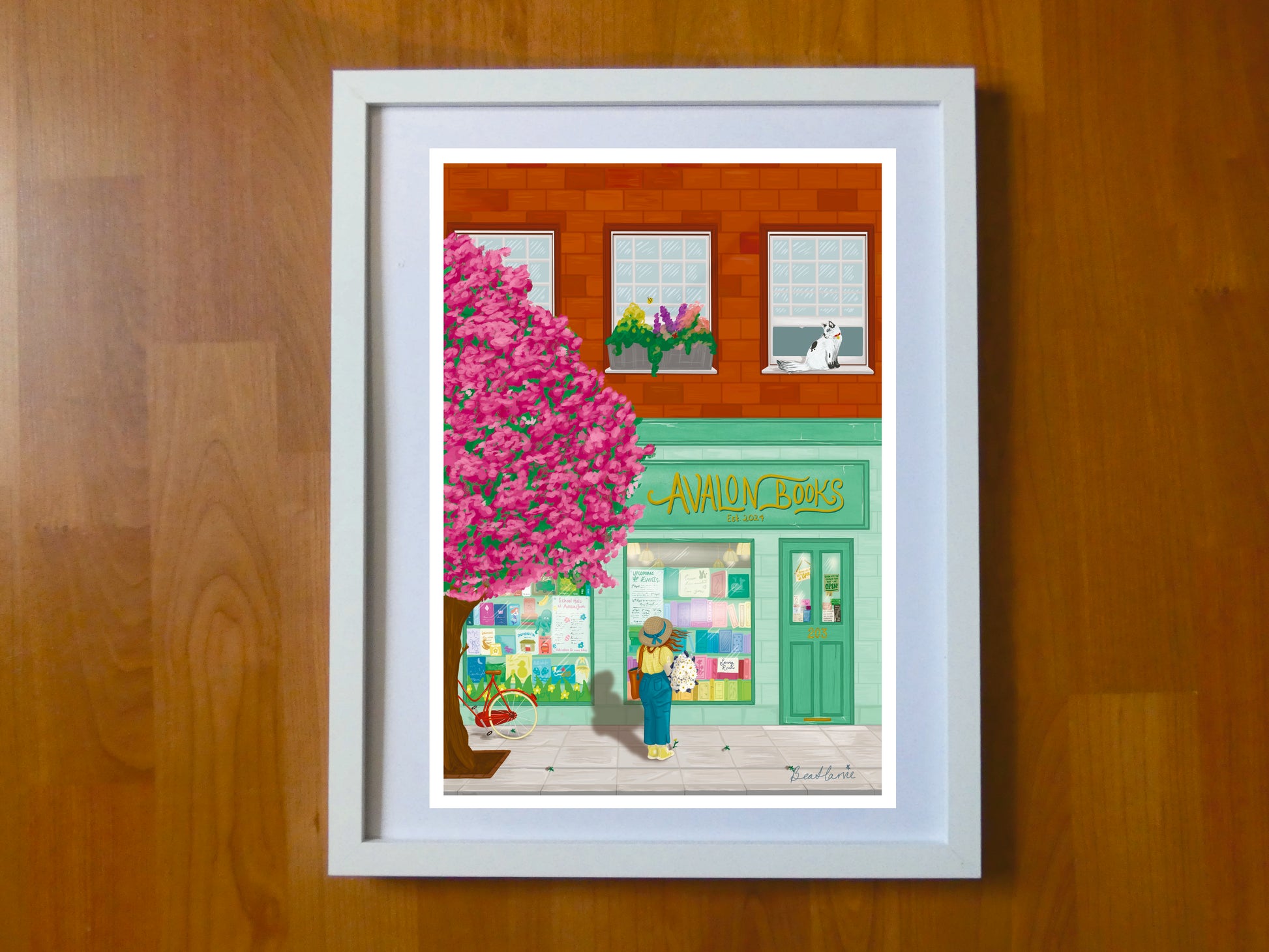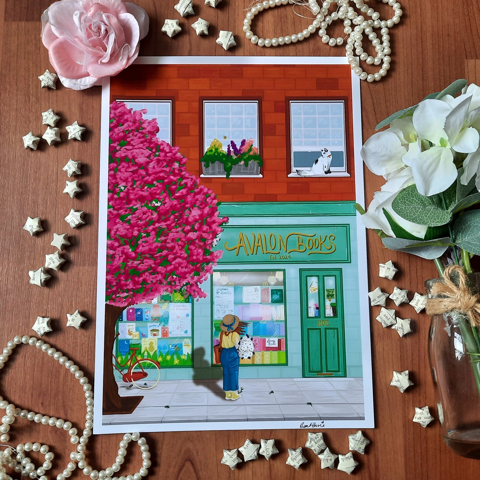 It's Spring at Avalon Books and the flowers are blooming! Join Daisy as she browses the new window display in the sunshine. This bright and cheerful bookshop art print would make a wonderful addition to a home library or a marvellous gift for book lovers.