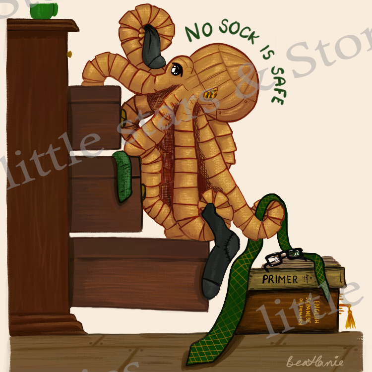 The Watchmaker of Filigree Street by Natasha Pulley was introduced to me by a friend, and I fell completely head over heels in love with the steampunk world, the characters and especially a little mechanical octopus with a randomised mechanism called Katsu. Katsu is a marvellous character in his own right, causing problems in Keita Mori's watch shop on Filigree Street and with a propensity to collect socks high in a cupboard where Mori cannot get them. When Thaniel moves in, he starts losing clothes as well. "Sock Thief" is an ode to this chaotic little mechanical octopus happily stealing socks from his family.