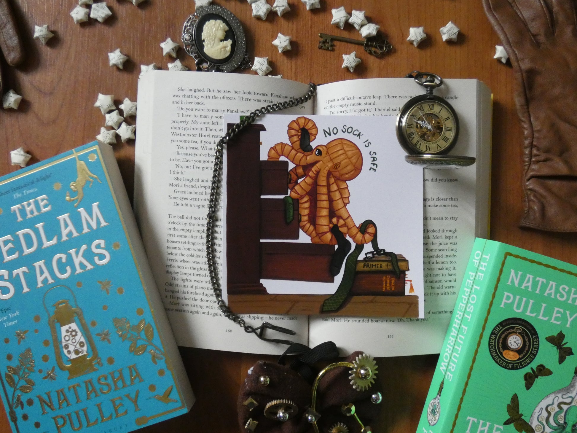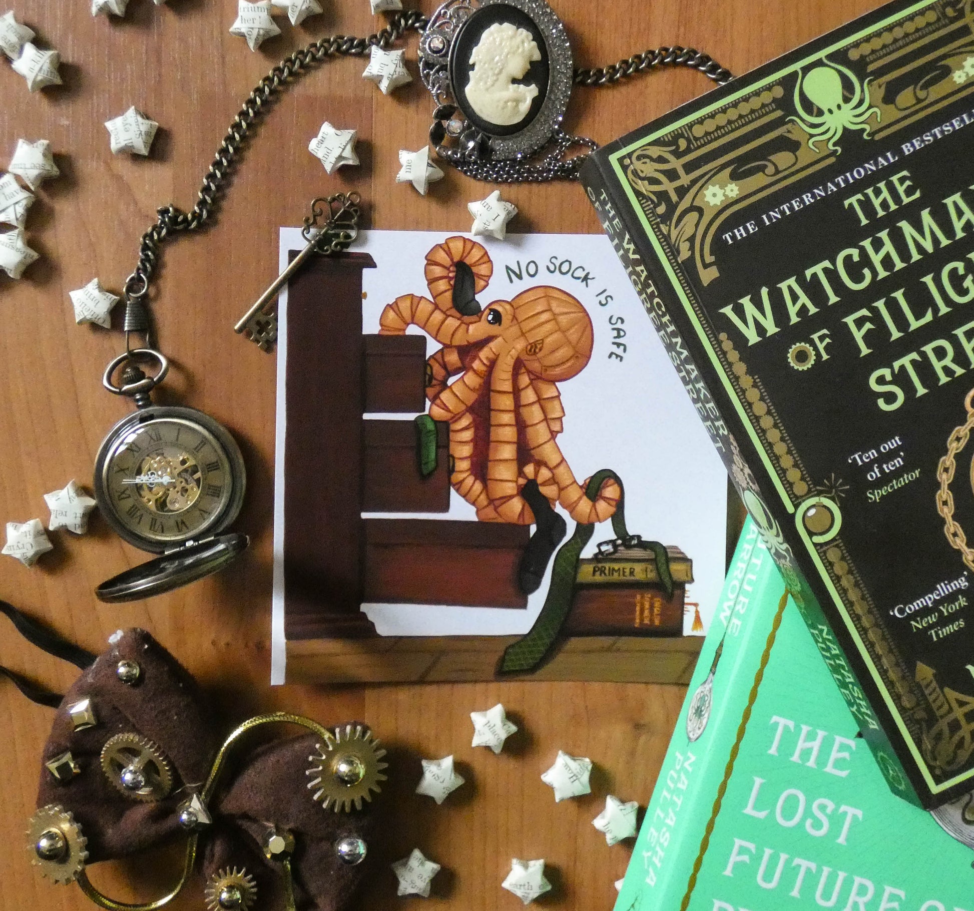This vibrant and colourful art print features Katsu the mechanical Octopus in the middle of stealing Thaniel Steepleton's socks and a Watchmaker-cover coloured tie from an open set of drawers, using Thaniel's Japanese Primer and a stack of books for balance.