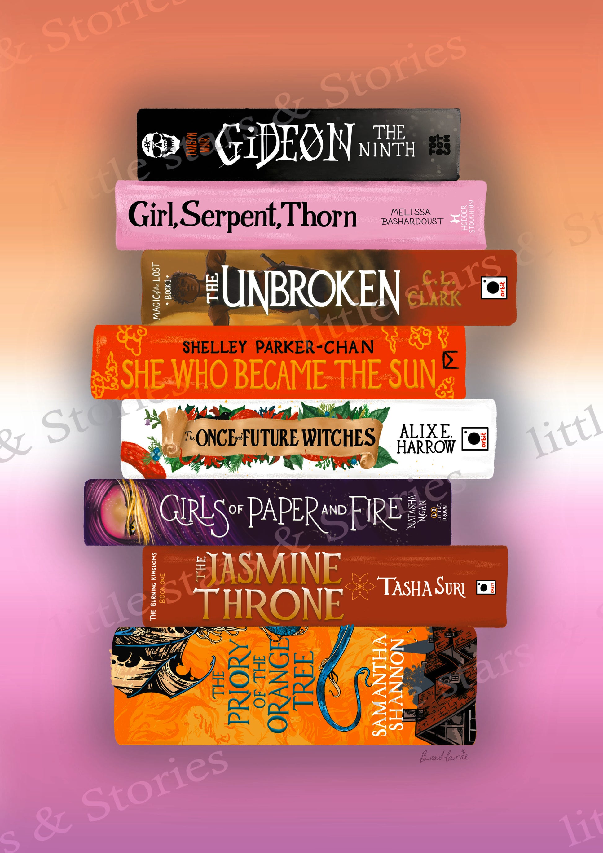 To brighten up your wall, a bright and colourful bookstack featuring some incredible fantasy books with at least one main sapphic relationships.