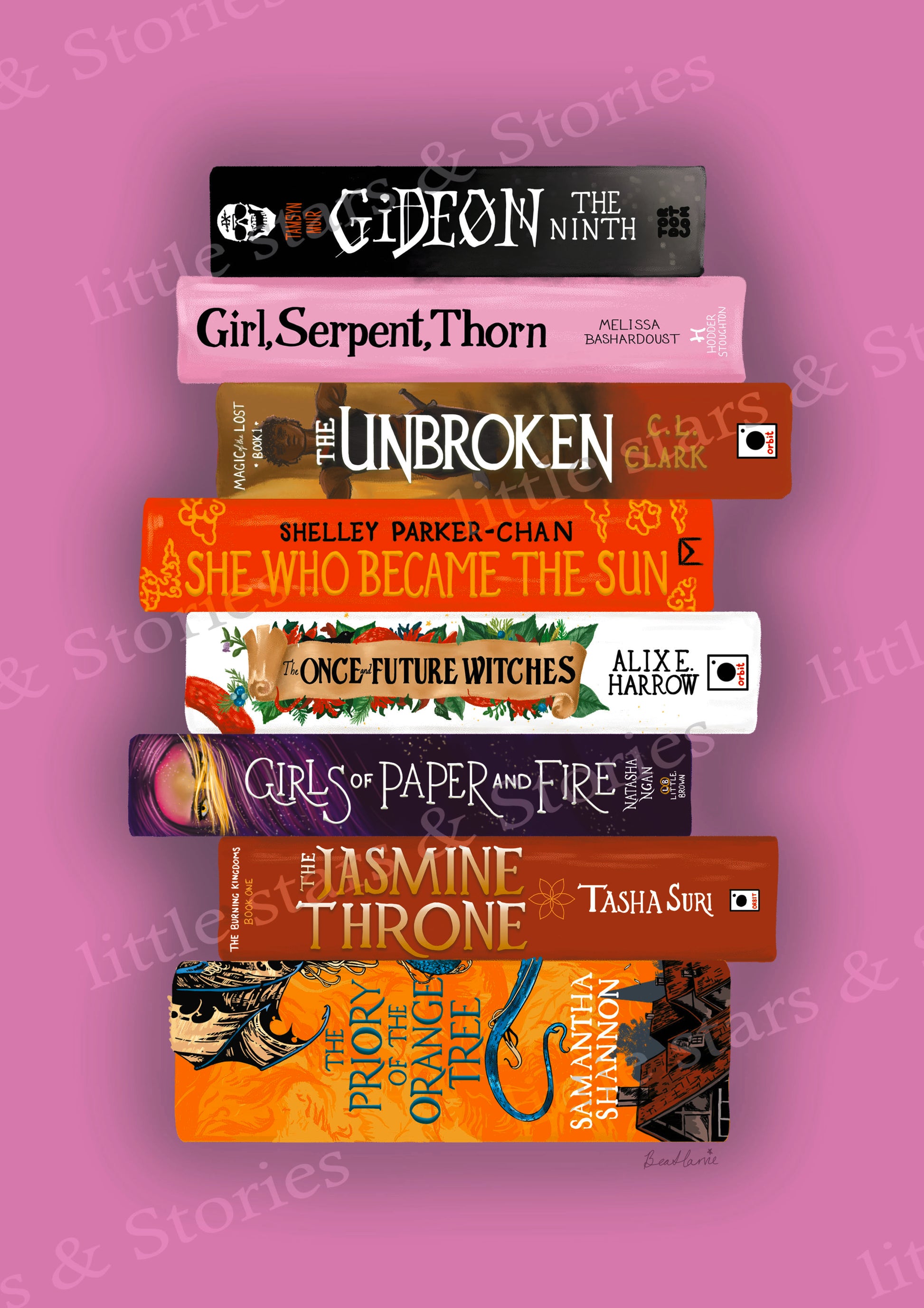 The books featured are (bottom to top): The Priory of the Orange Tree; The Jasmine Throne; Girls of Paper and Fire; Once & Future Witches; She Who Became The Sun; Girl, Serpent Thorn; Gideon the Ninth