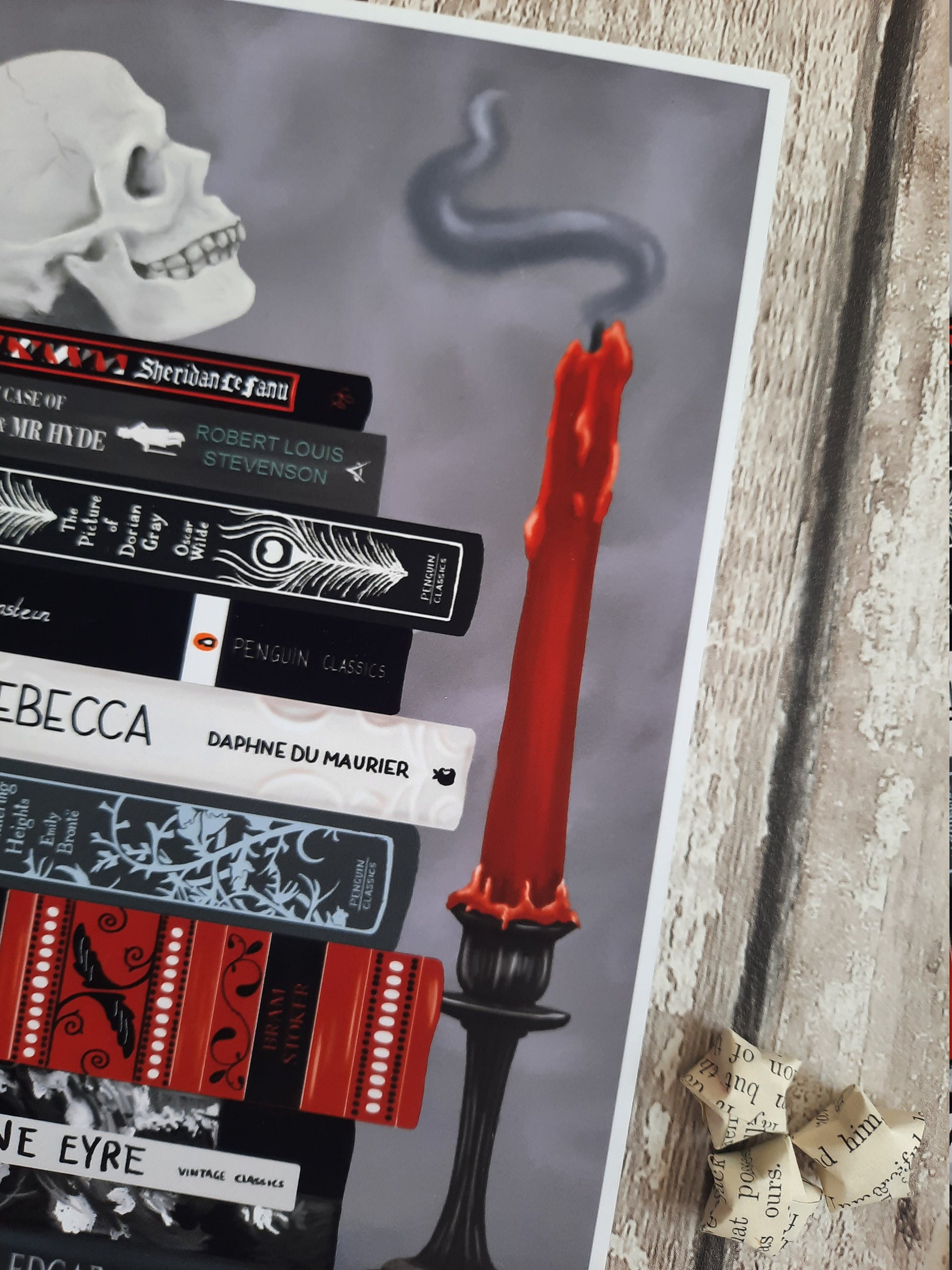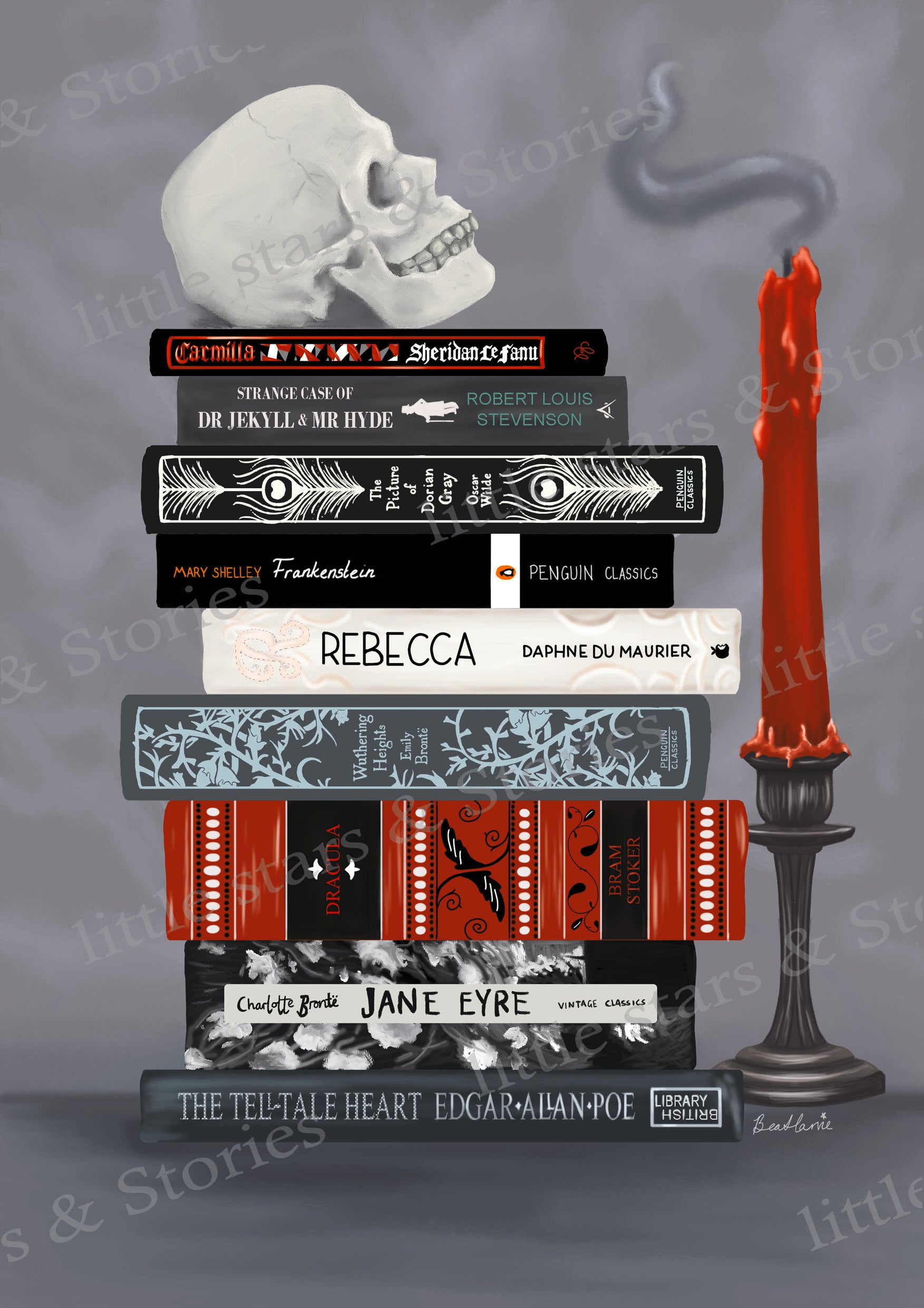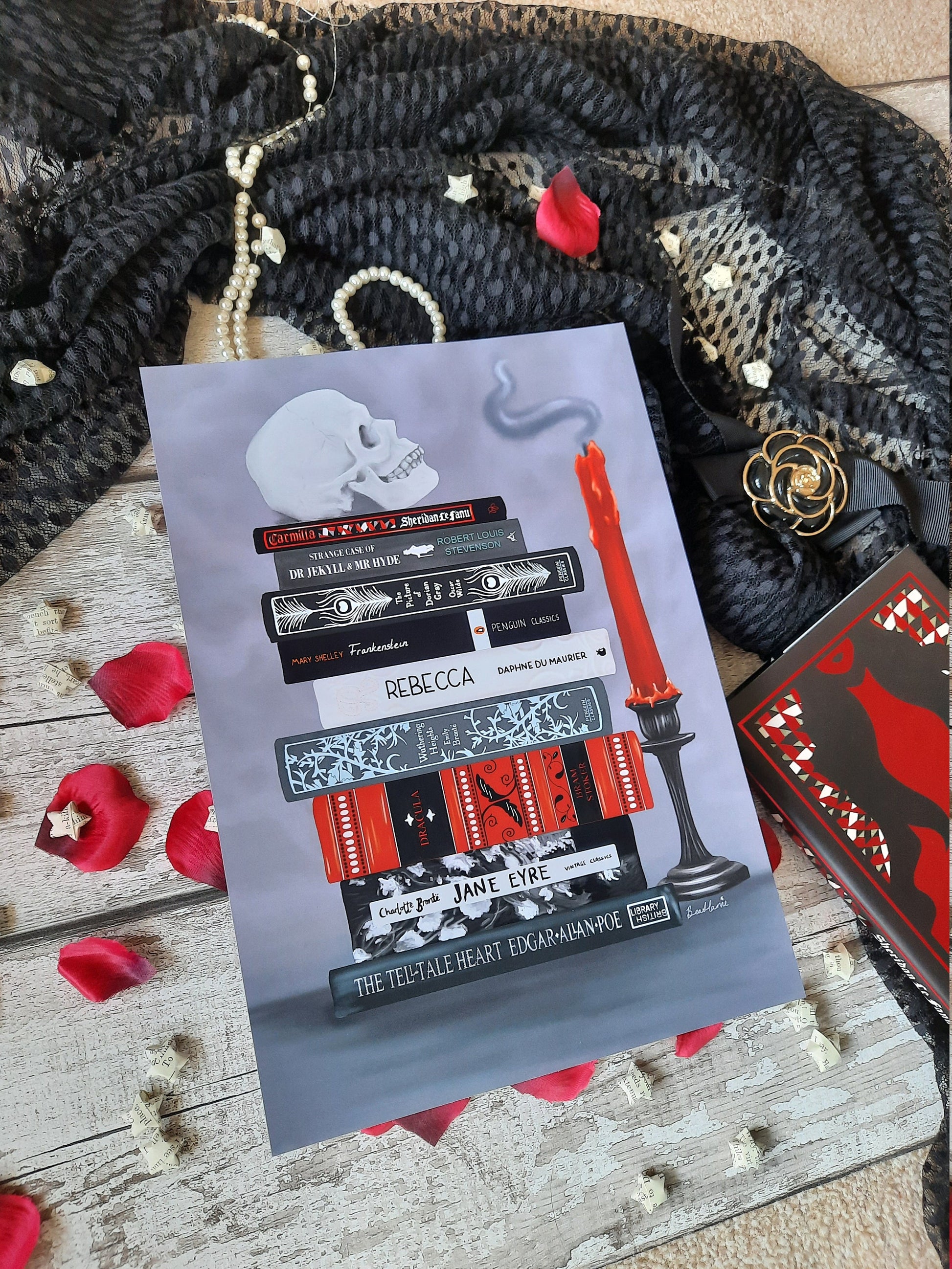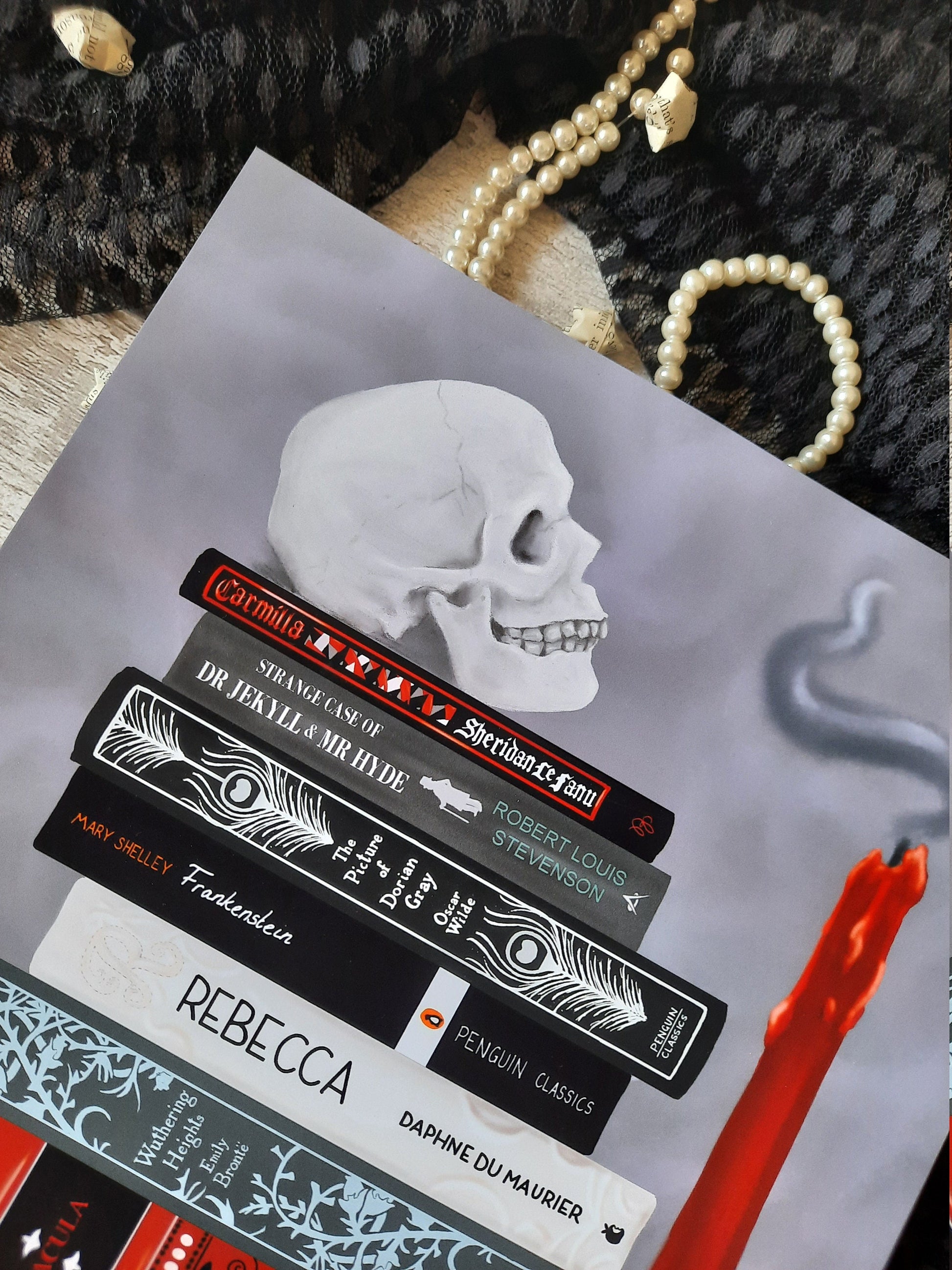 This is an illustration of some gorgeous editions of gothic classics like Dracula, Rebecca, Frankenstein, Carmilla ect. The books are stacked haphazardly in a dark academic style setting with a skull and blown out red candle .
