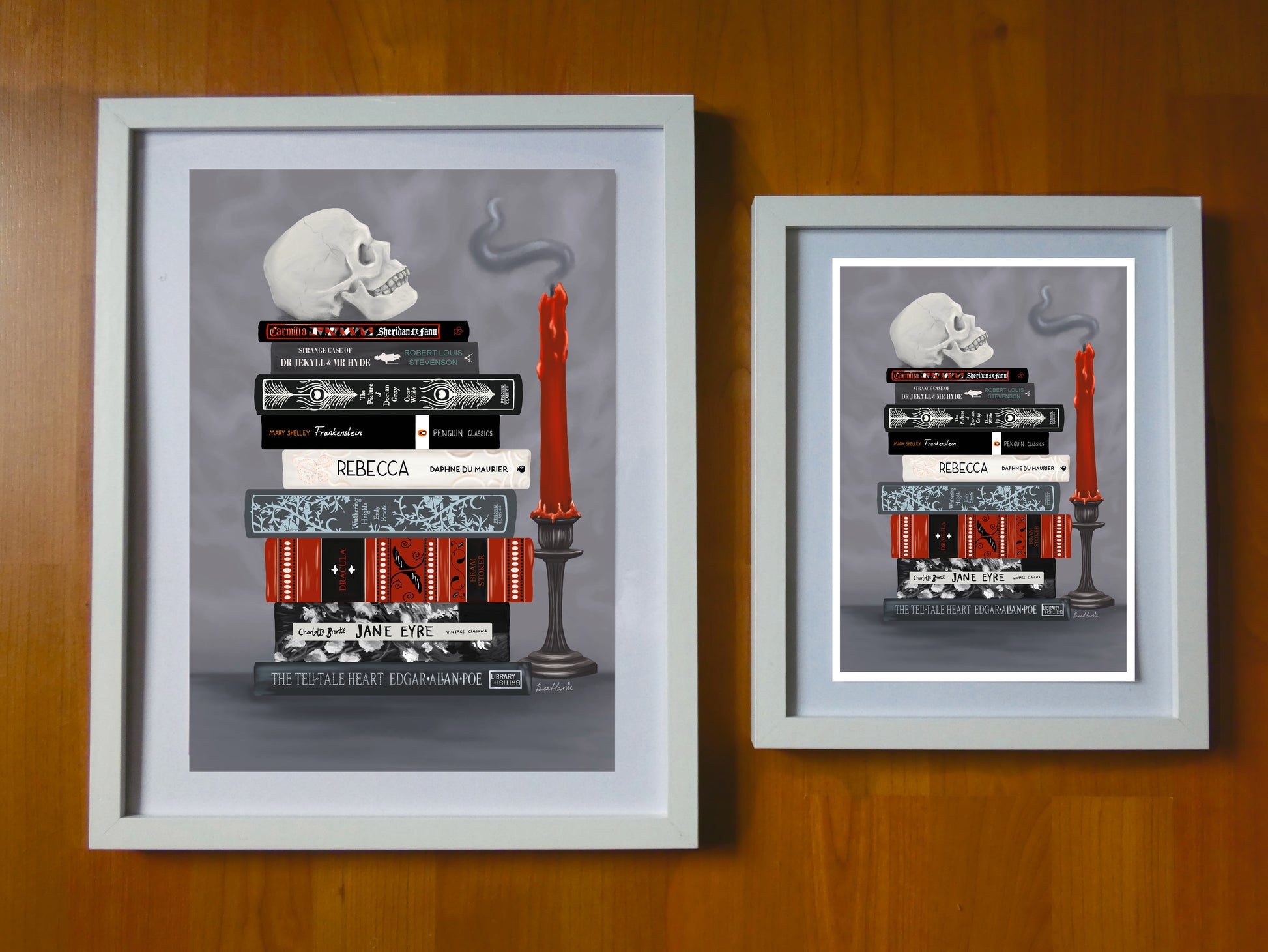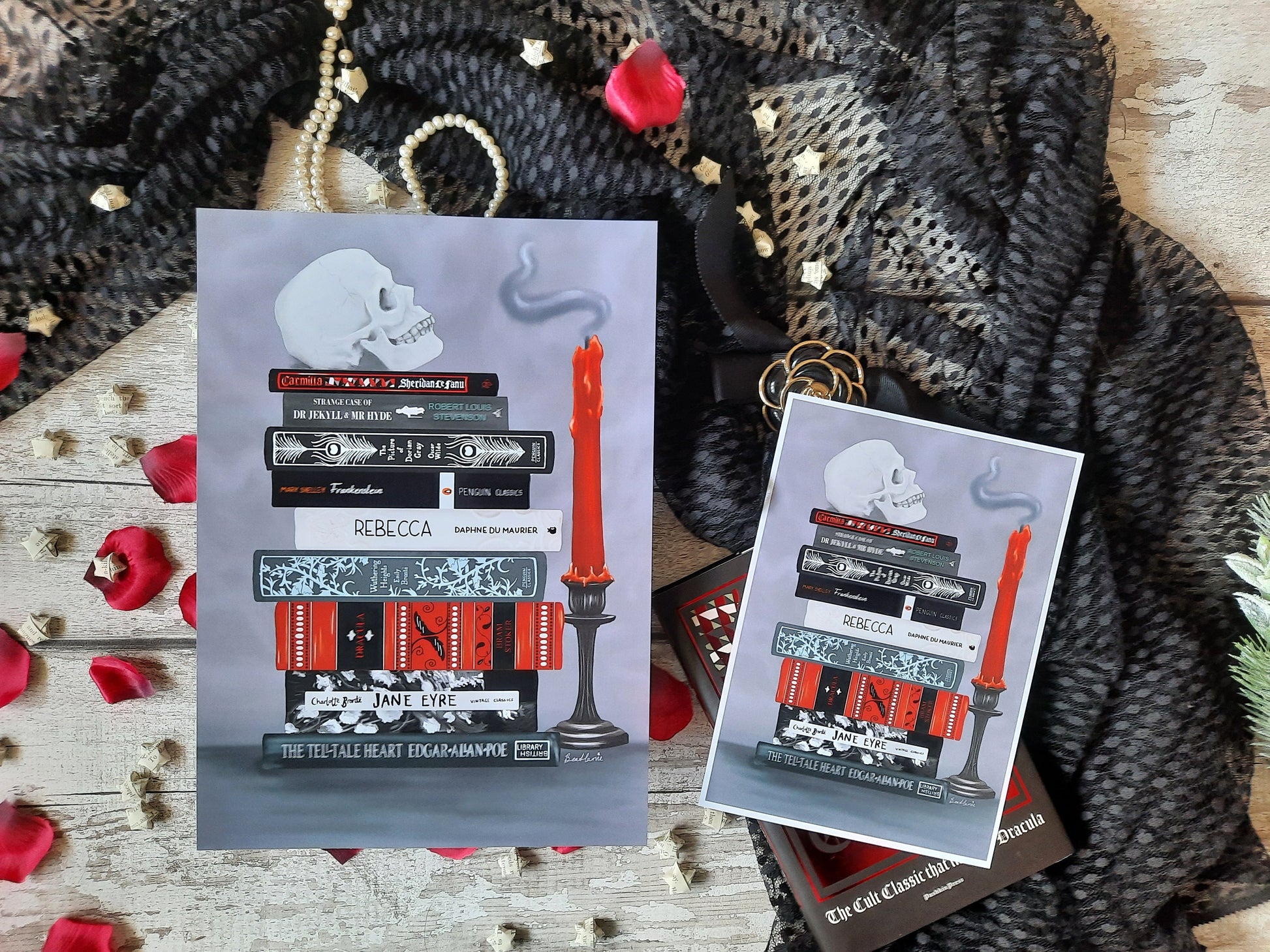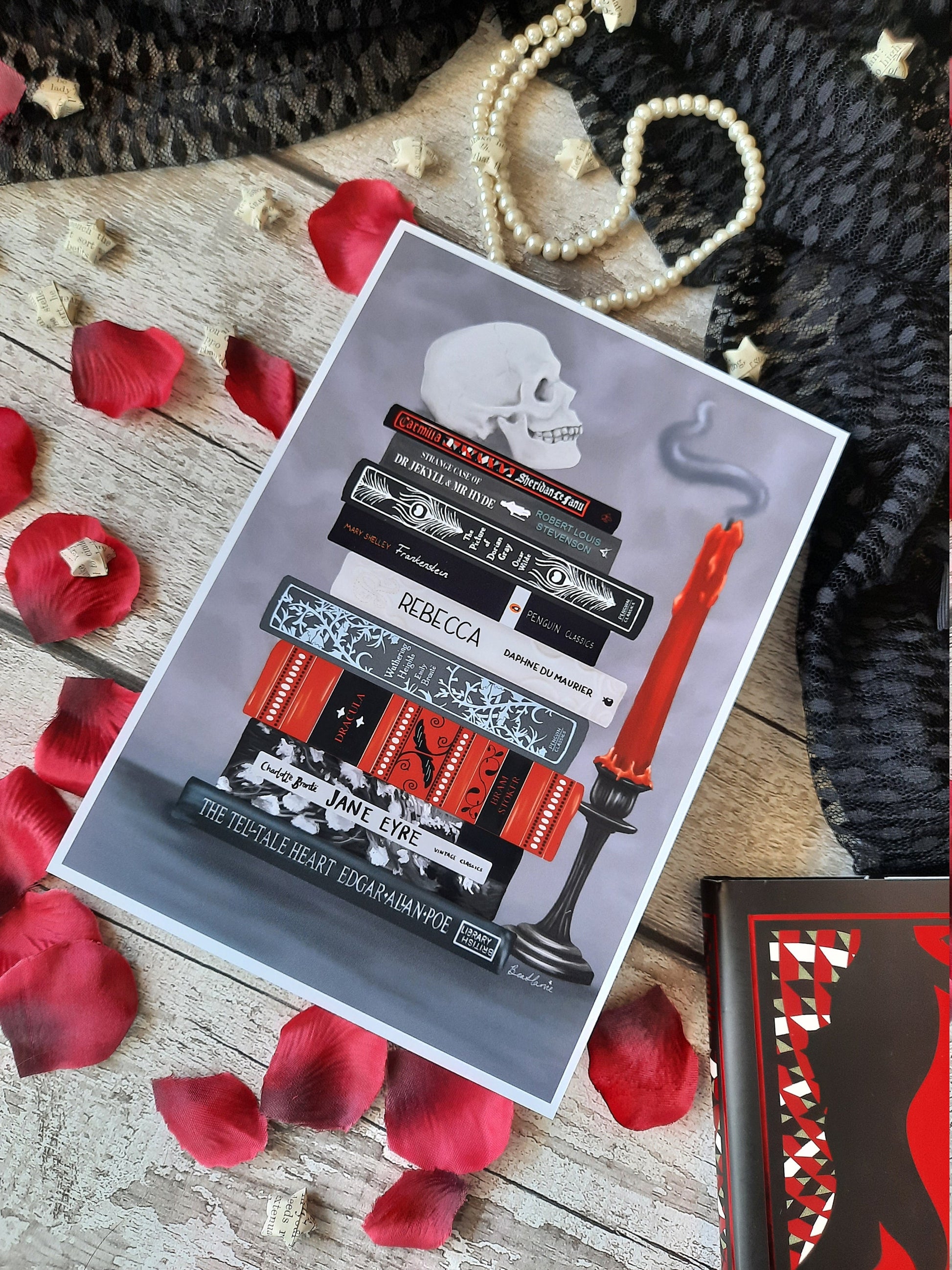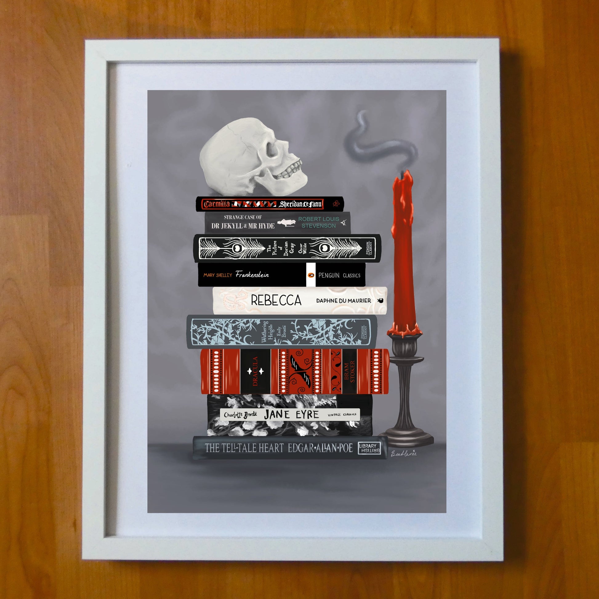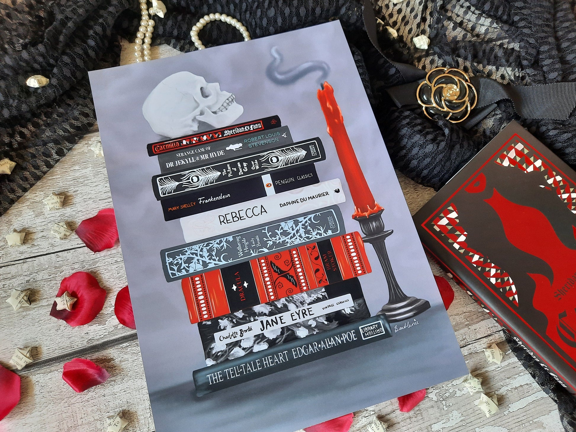 This is an illustration of some gorgeous editions of gothic classics like Dracula, Rebecca, Frankenstein, Carmilla ect. The books are stacked haphazardly in a dark academic style setting with a skull and blown out red candle .