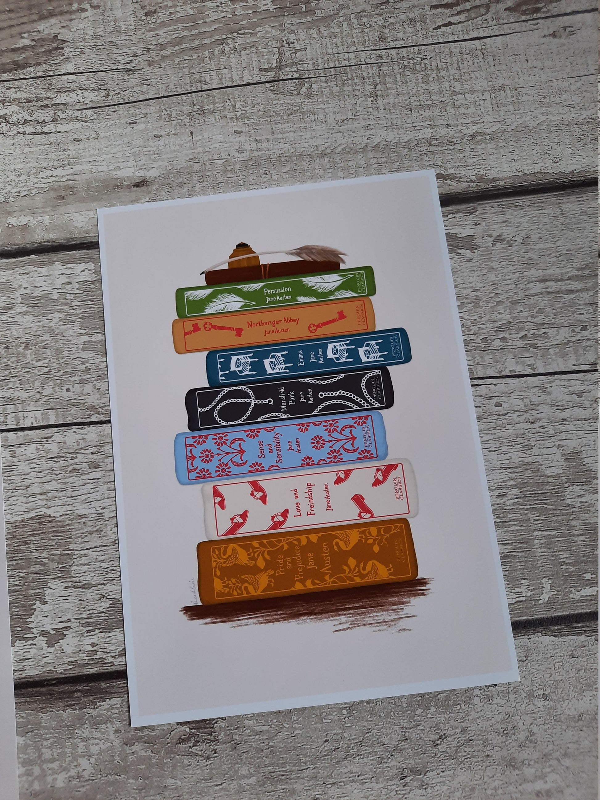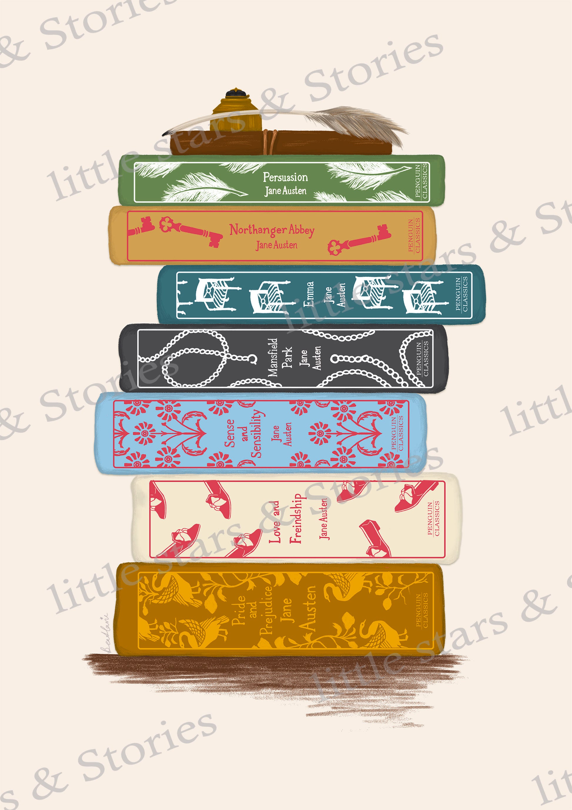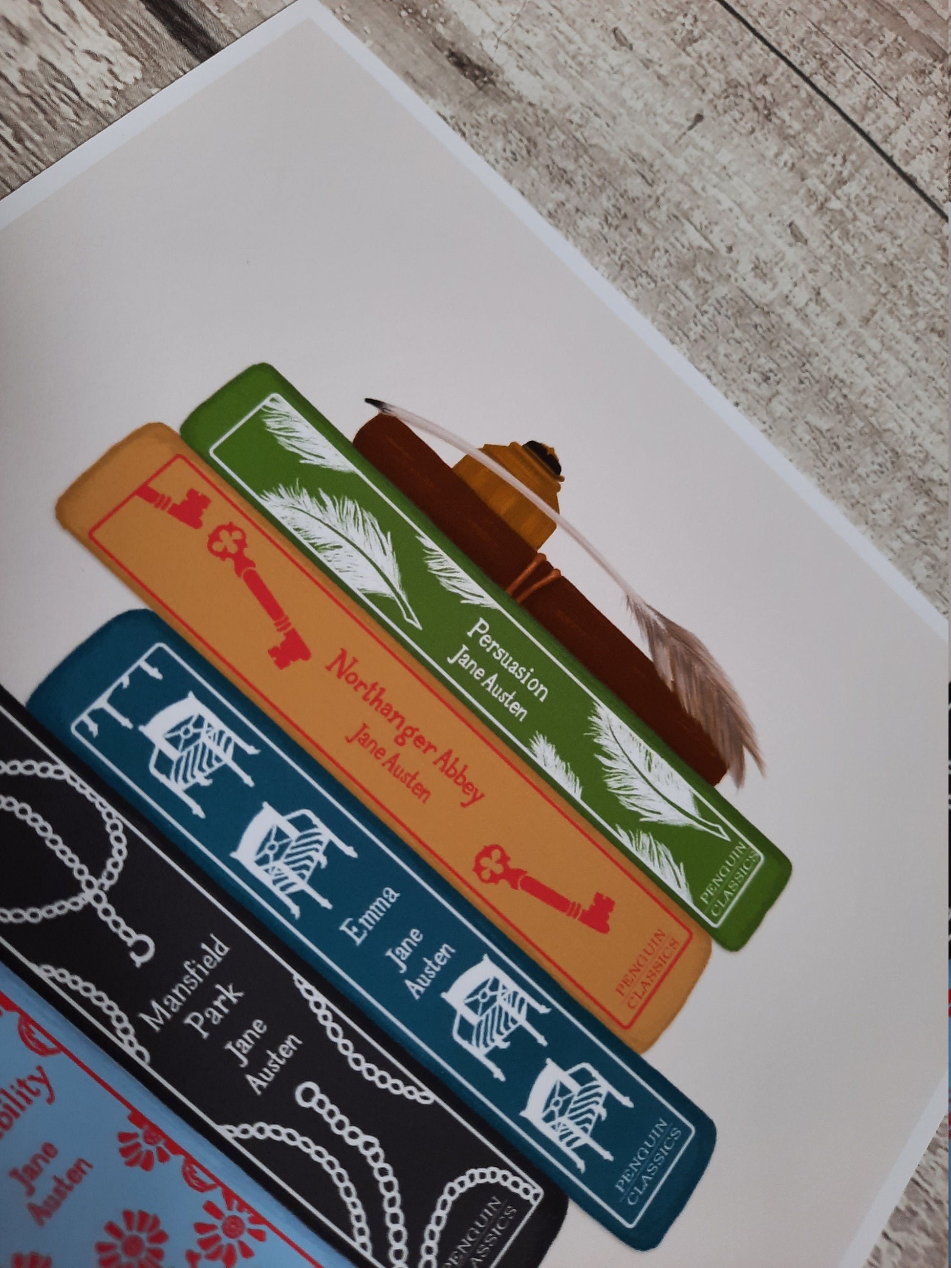 In case (like me) you can't justify having seven different versions of Jane Austen's romantic masterpieces on your shelf, here is an illustration for you fellow Austen lovers out there. Featuring the gorgeous Penguin Clothbound Classics stacked up in beautiful pastels with a notebook, quill and ink sitting atop the stack, waiting for her next marvellous idea.
