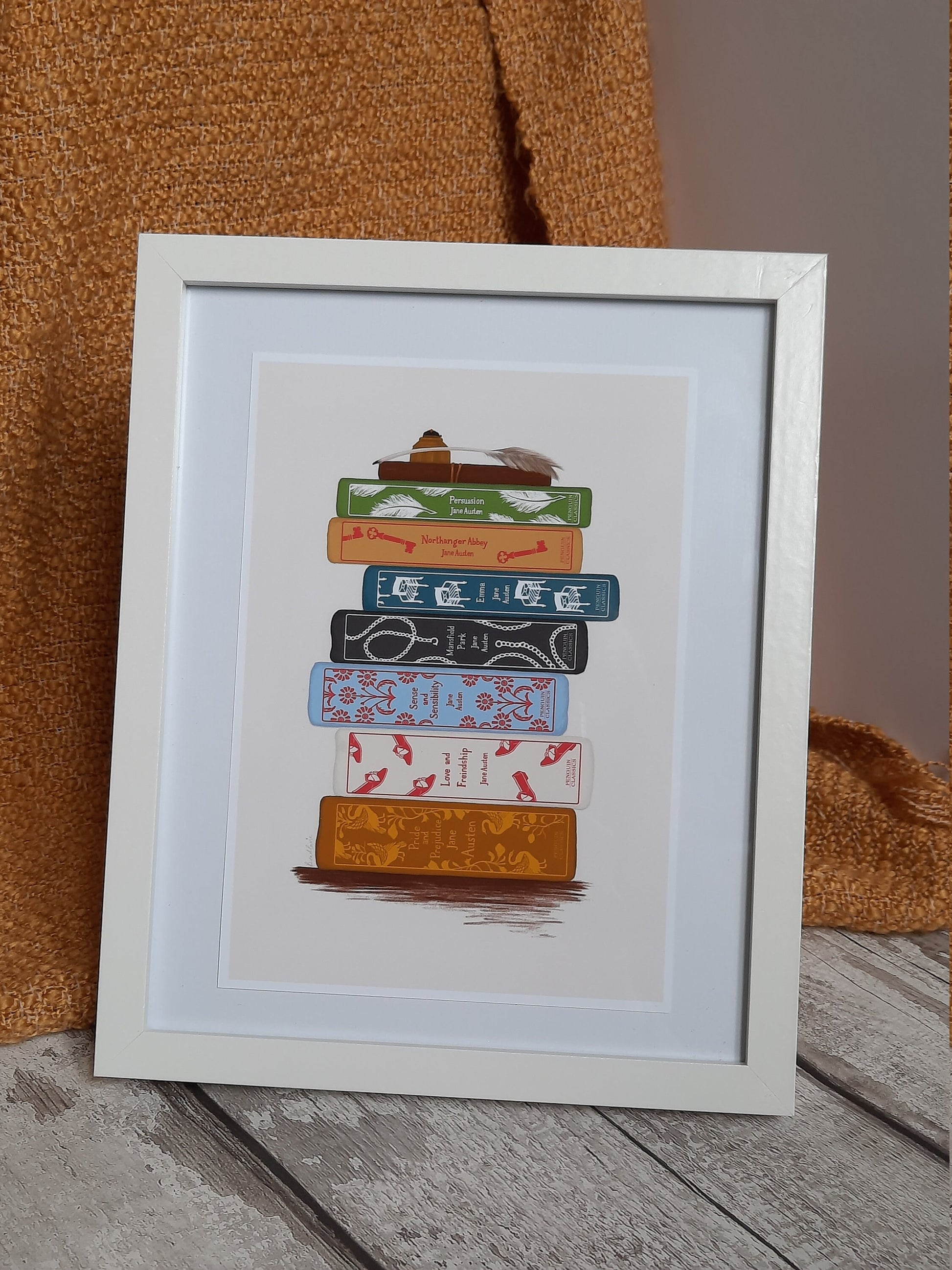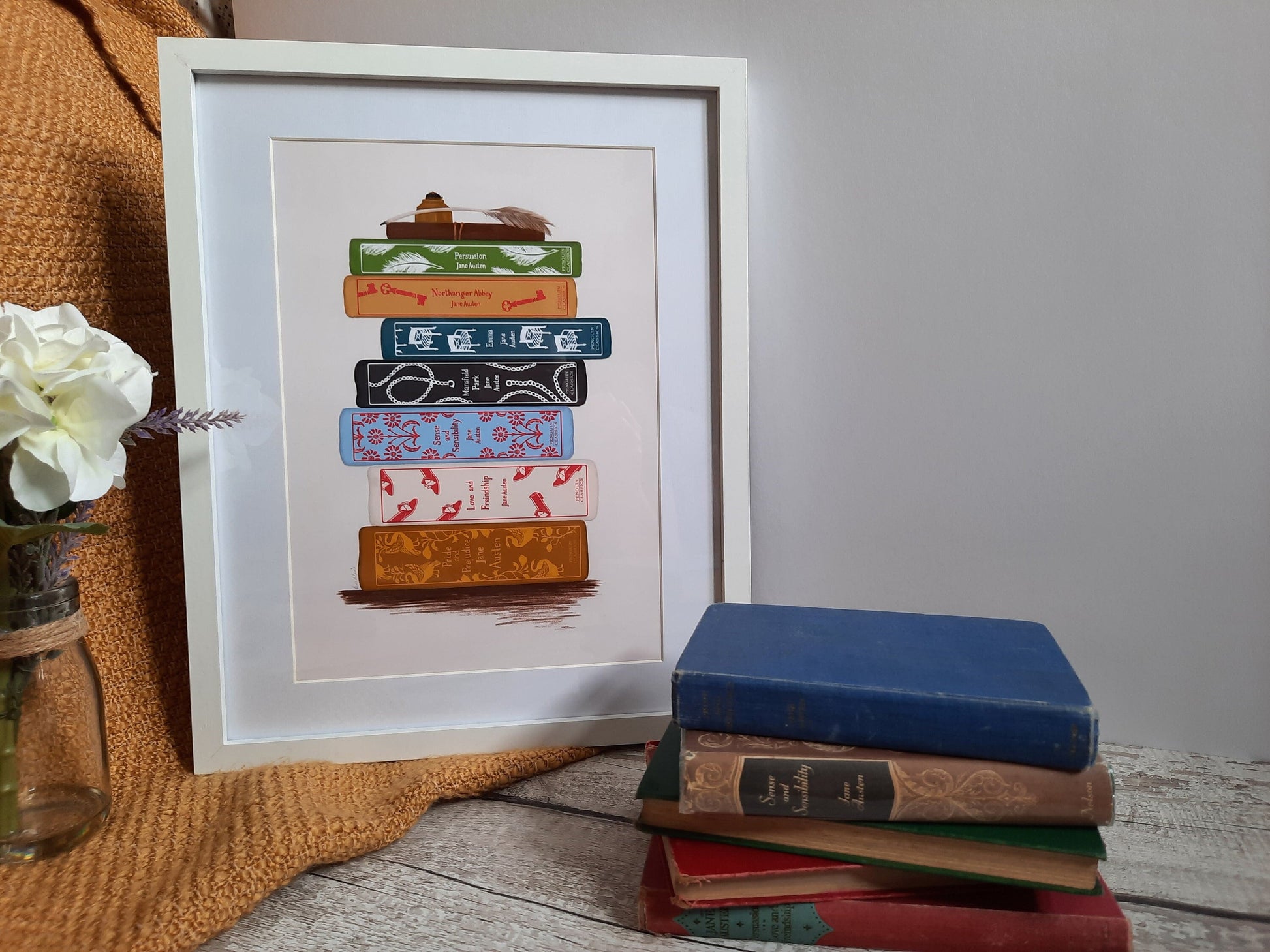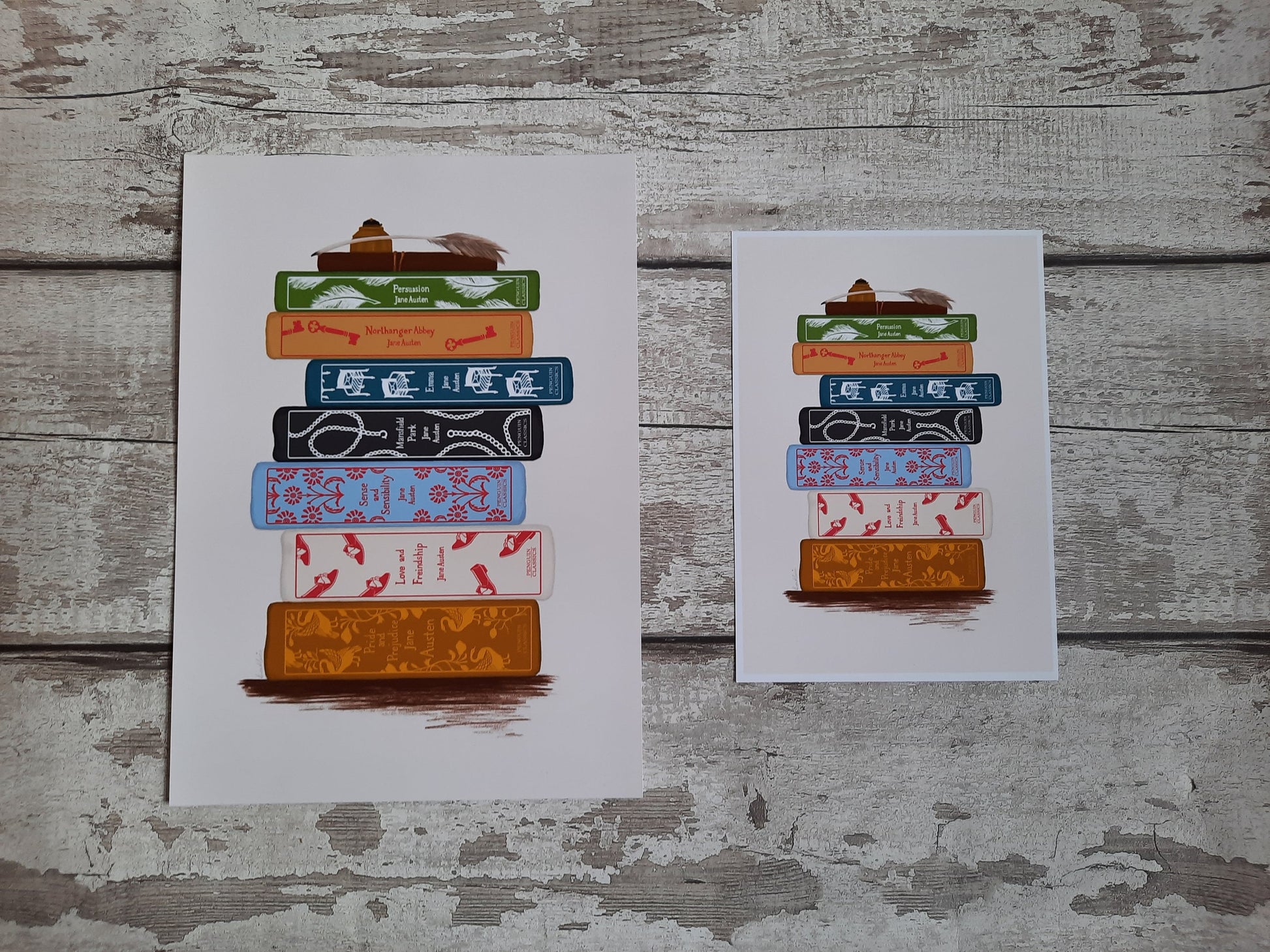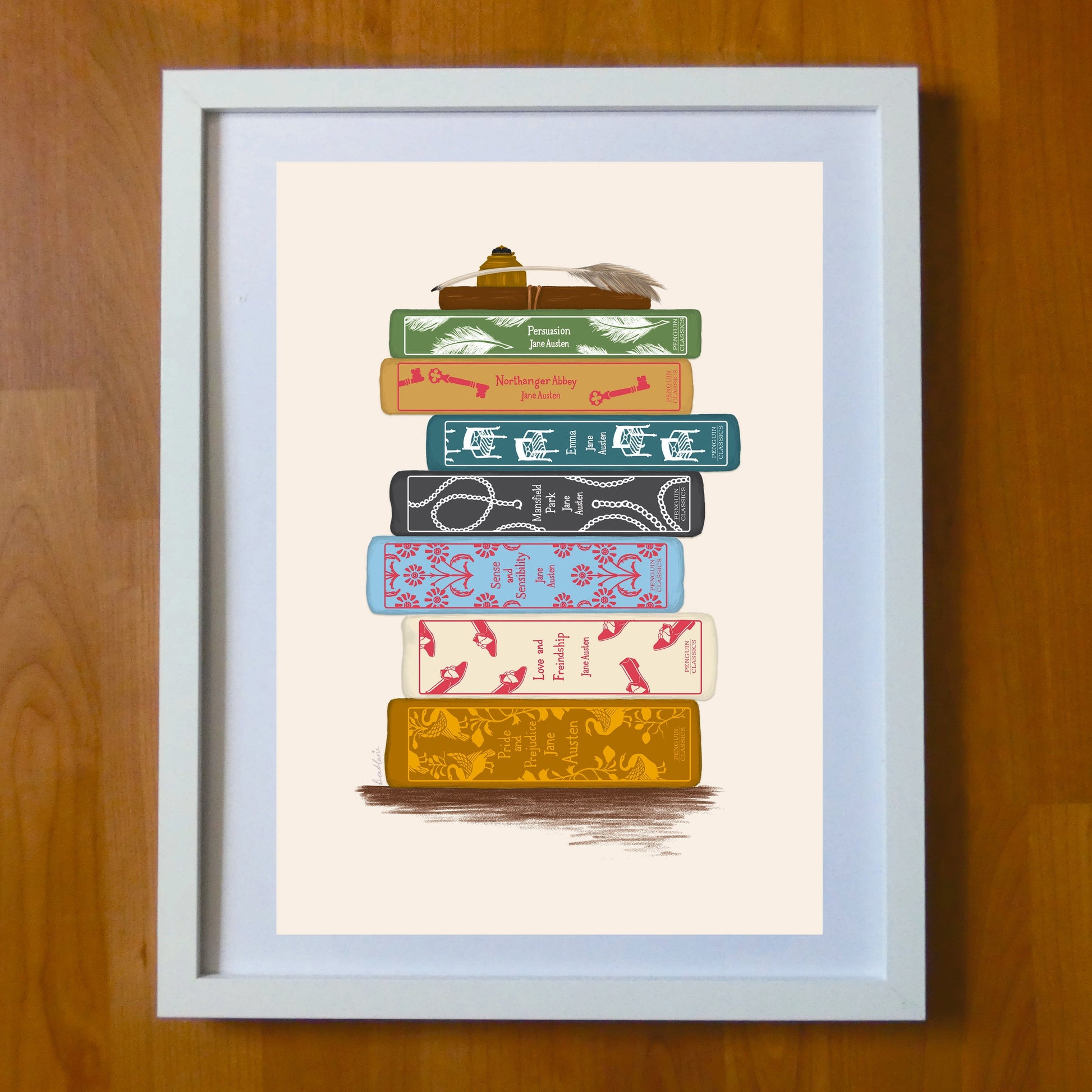 In case (like me) you can't justify having seven different versions of Jane Austen's romantic masterpieces on your shelf, here is an illustration for you fellow Austen lovers out there. Featuring the gorgeous Penguin Clothbound Classics stacked up in beautiful pastels with a notebook, quill and ink sitting atop the stack, waiting for her next marvellous idea.