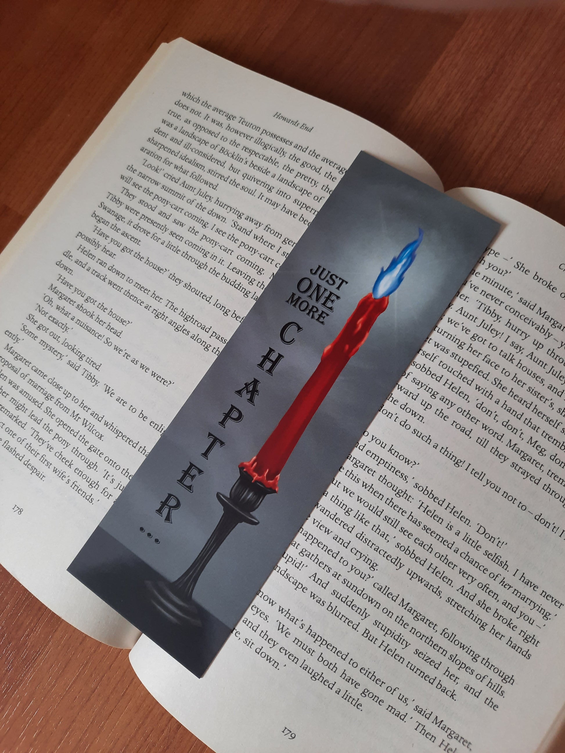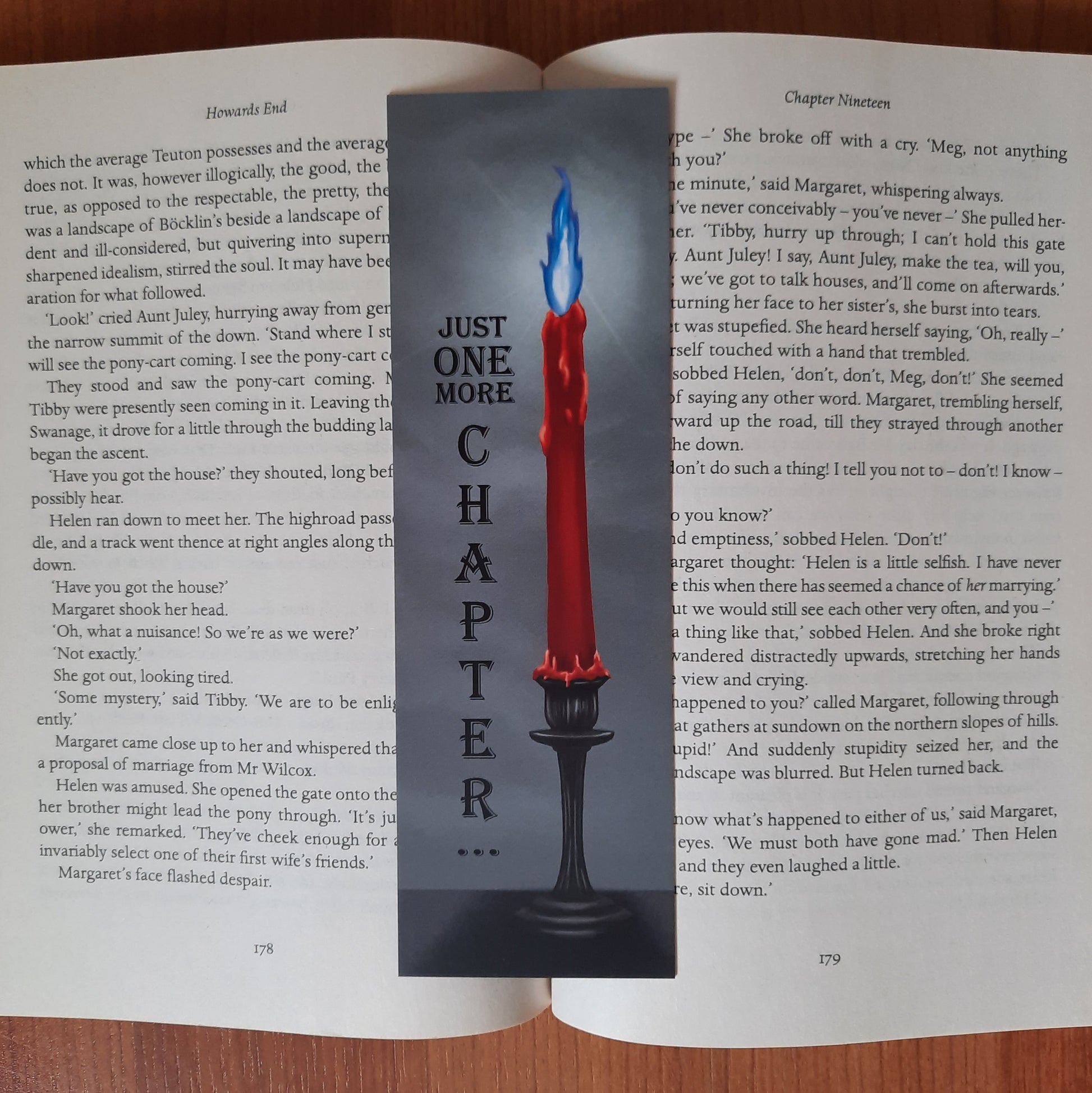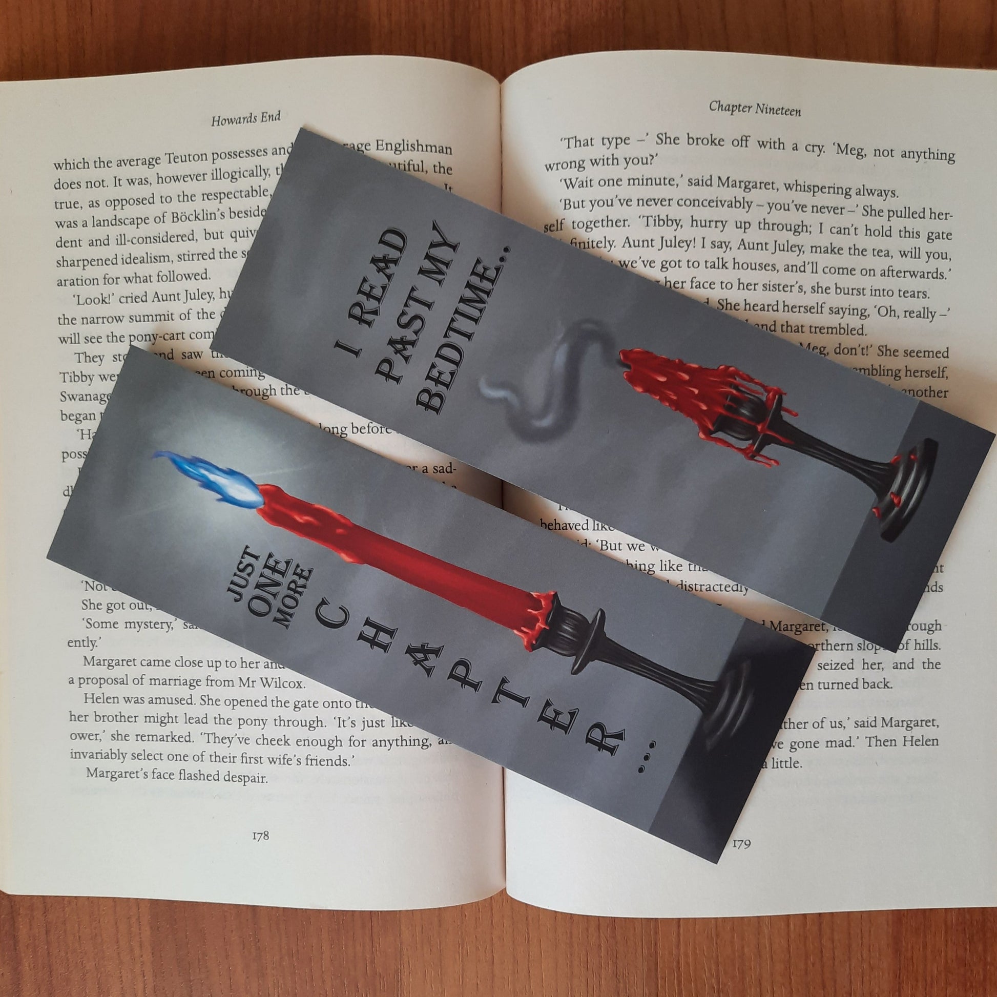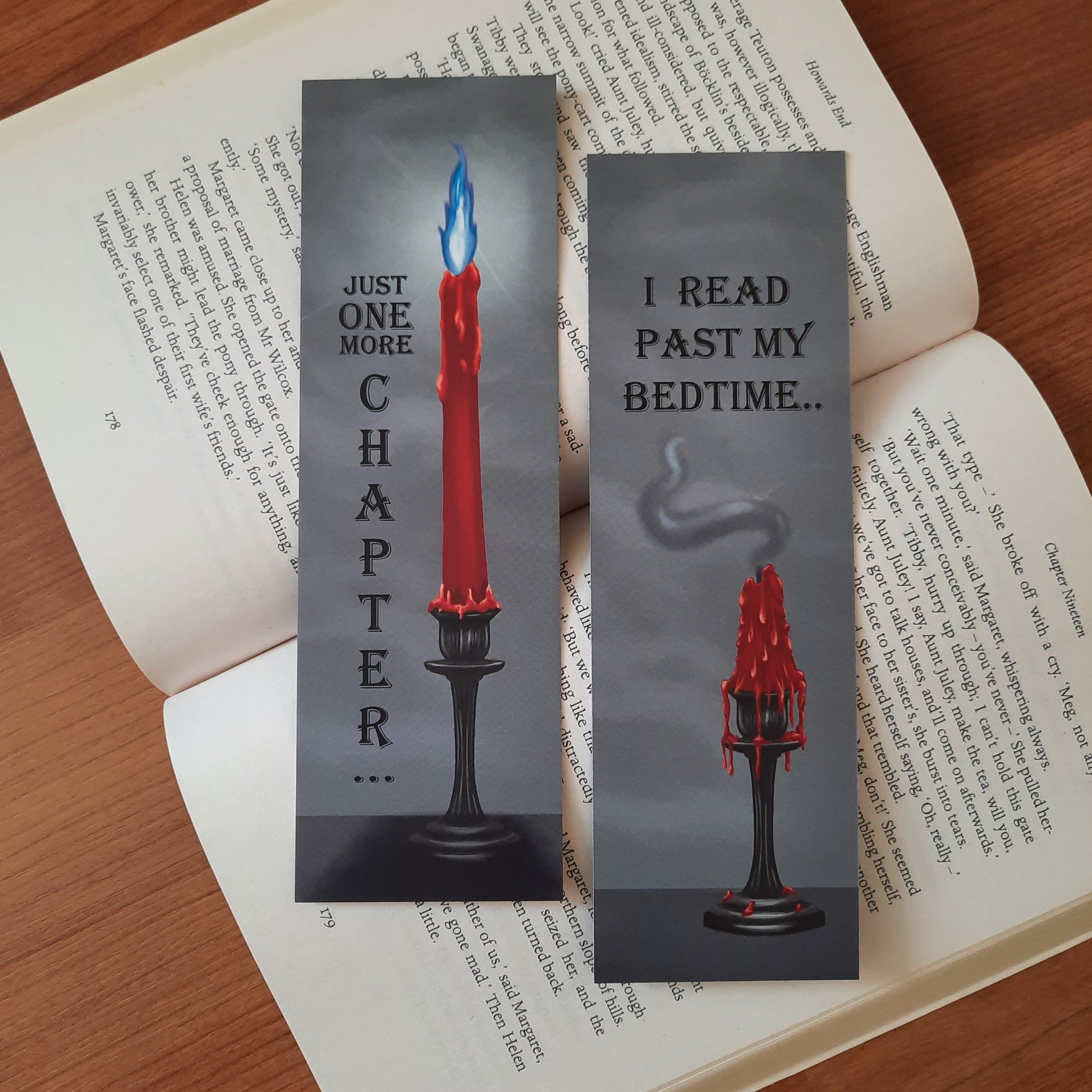 A spin off from the Gothic literature bookstack, this bookmark features a gothic candle in red with a blue-white flame with "just one more chapter" written on one side. The reverse of the bookmark is the candle worn down to a waxy mess having blown itself out, with "I read past my bedtime" A marvellous little gift for bookworms, especially those who burn the candle to keep reading longer!