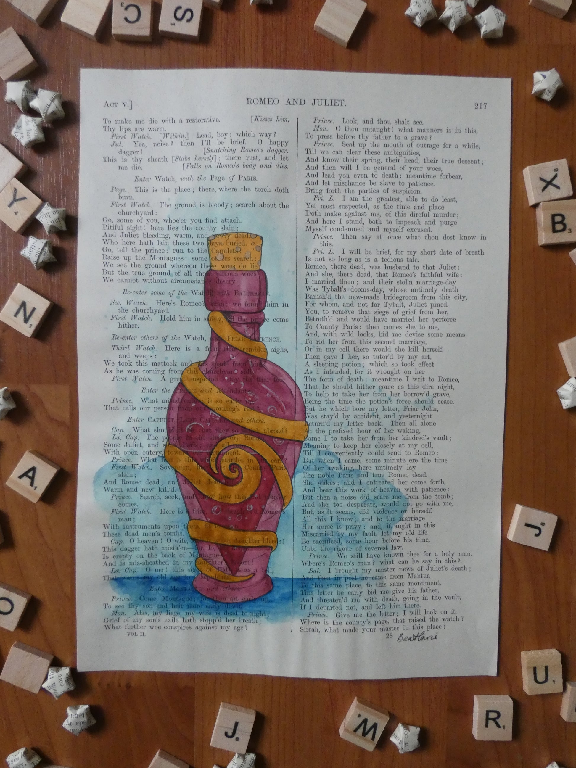 "The Prettiest Poison" is painted in watercolour and gold acrylic directly onto a page of Shakespeare's Romeo and Juliet. This is an upcycled book page into an unframed, A4 original and unique art work.