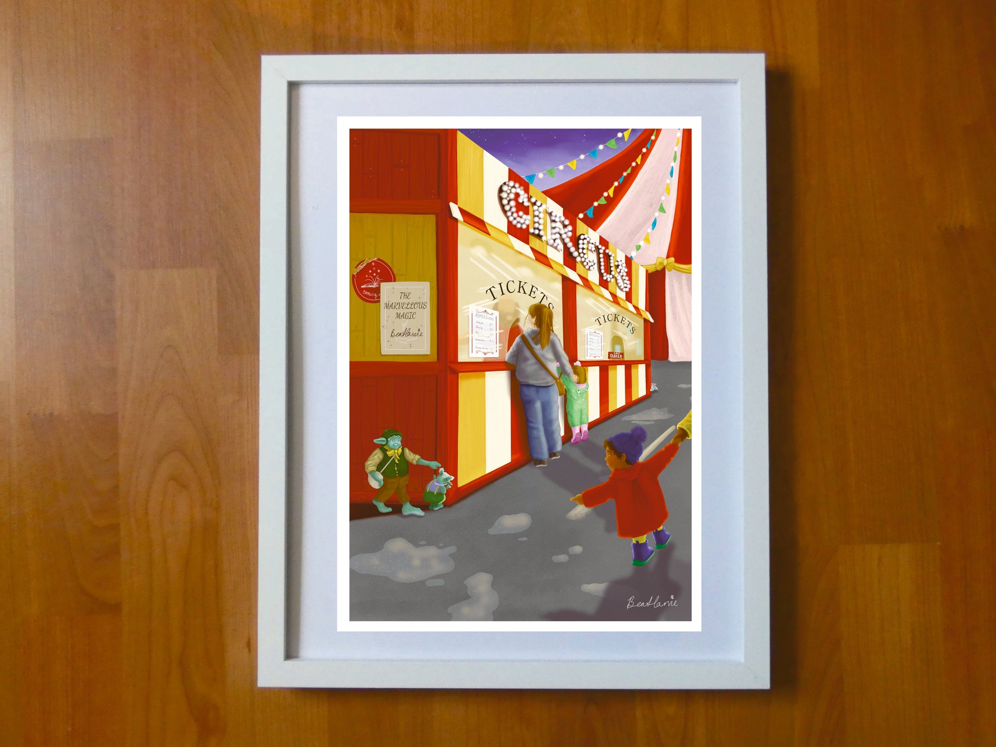 The characteristics of a circus are bright, vibrant colours, and a touch of magic and in this art print I combined the two, with a little bit of the other-world sneaking into the circus alongside all the children and their parents at twilight, full of bright colours and lights. This wall art is a little bit whimsical and bright with a pair of household fairies in the front, waiting for the humans to pass so they can enter.