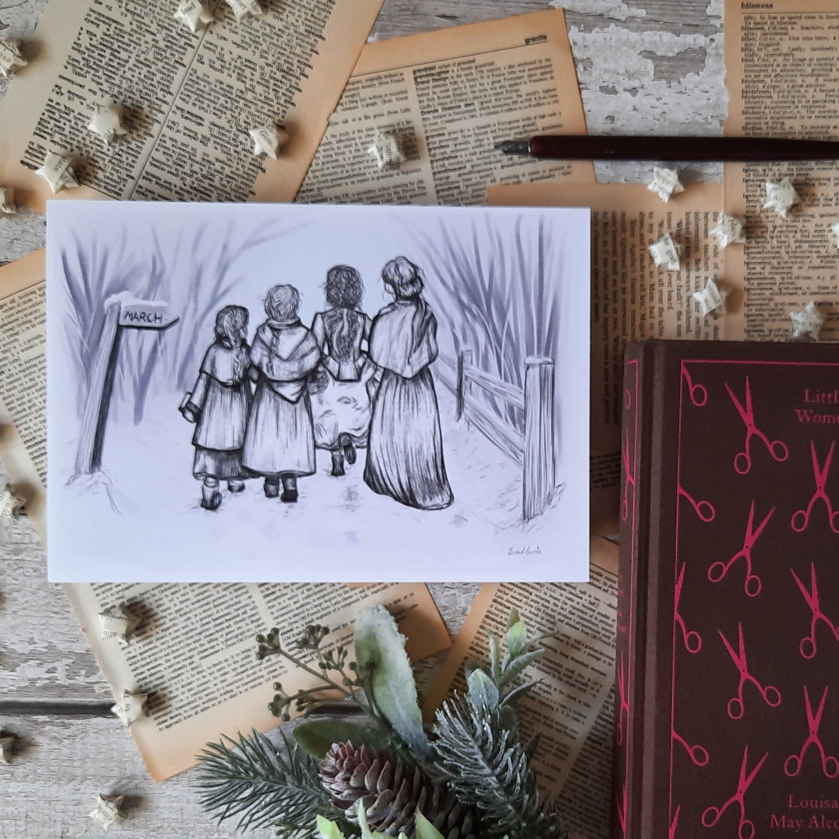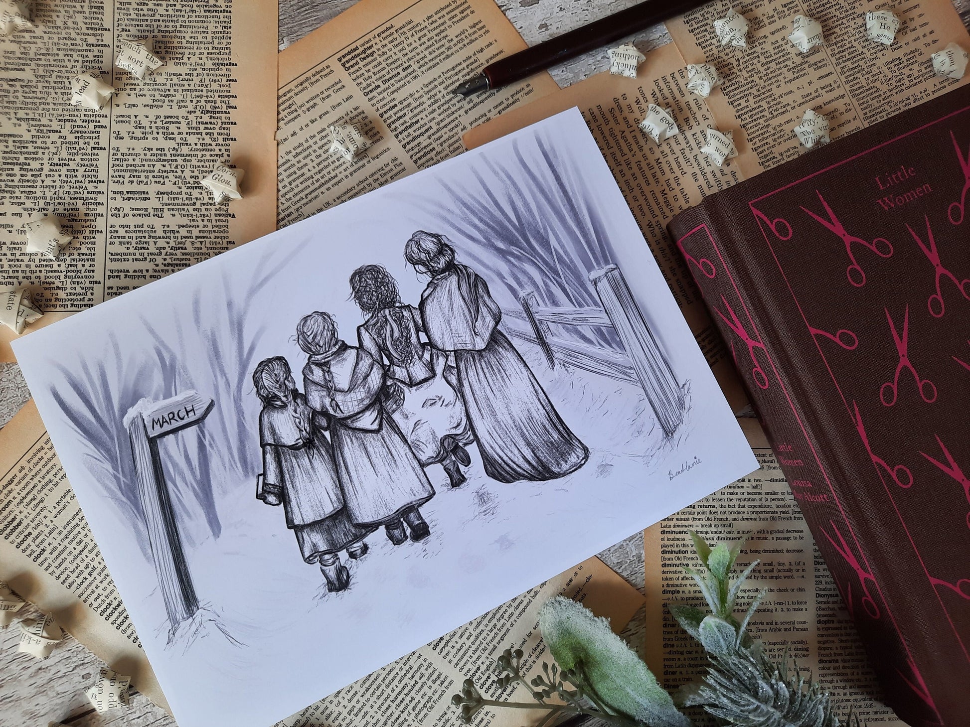 Around winter every year, I re-read Little Women. I adore Jo March's spirit and that Meg's dreams are of family and Amy's precocious nature and Beth's calm spirit. And this year, I put digital pencil to digital paper and drew one of the earliest scenes in the book, when the girls are walking to town one winter morning. This art print features all four sisters walking down a snow laden and tree lined lane - I say walking but Jo is making a bid for a little bit of freedom before going to sit with Aunt March...