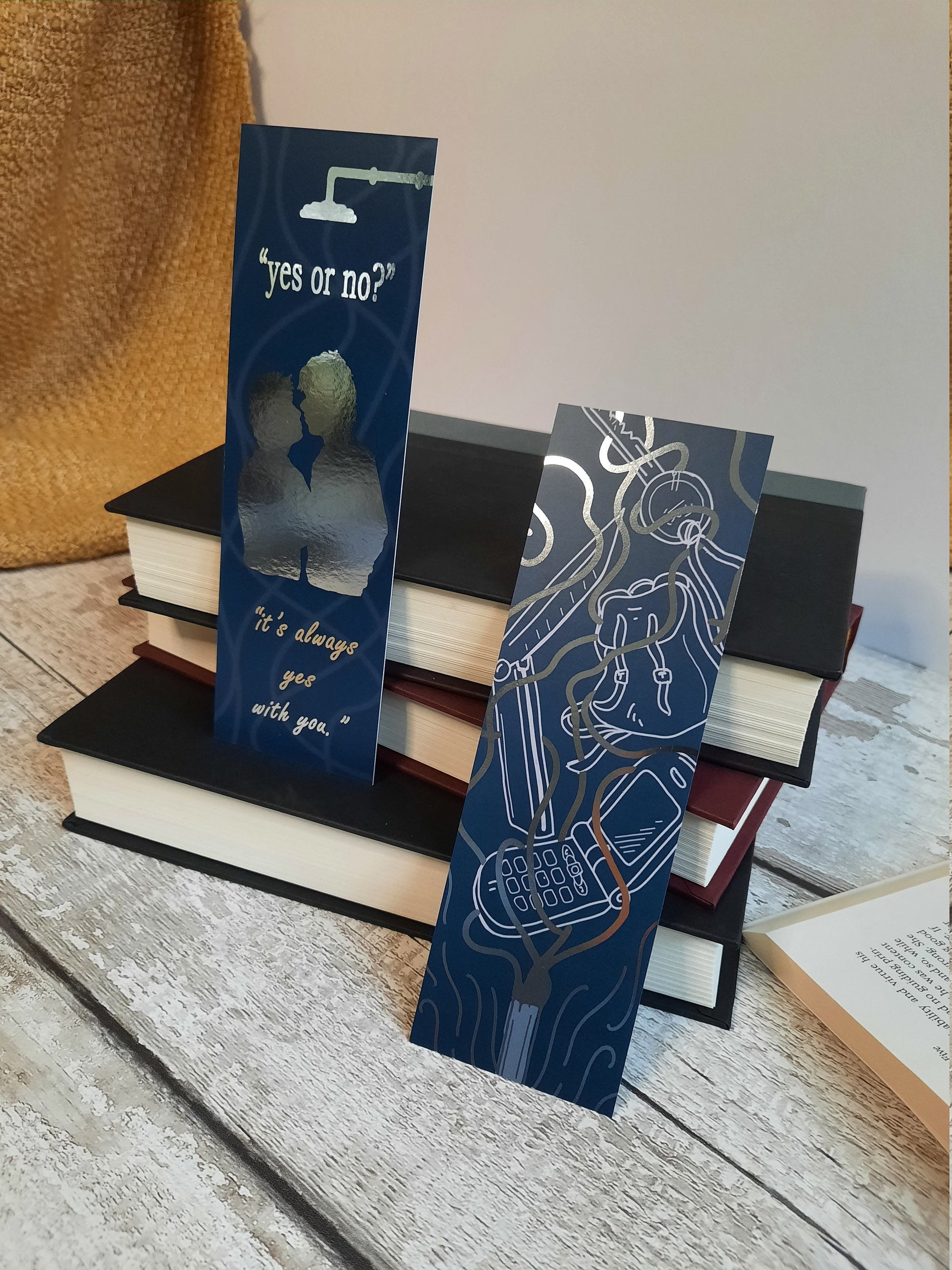 A shiny silver-foiled double-sided bookmark inspired by The Foxhole Court/All for the Game trilogy by Nora Sakavik. The bookmark is blue with grey and silver detail. The first side has Neil and Andrew with "Yes or no?" and "It's always yes with you." quote in silver foil. The second side has line drawings of a flip phone, a pocket knife, a rucksack and a key in grey, with a cigarette and "smoke" detail in silver foil.
